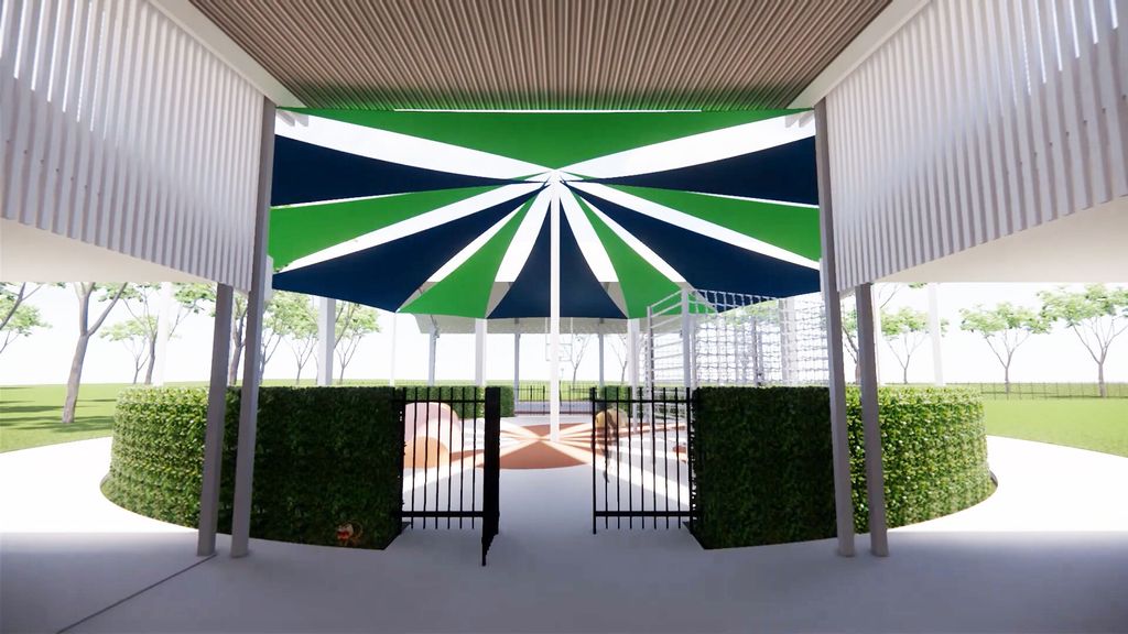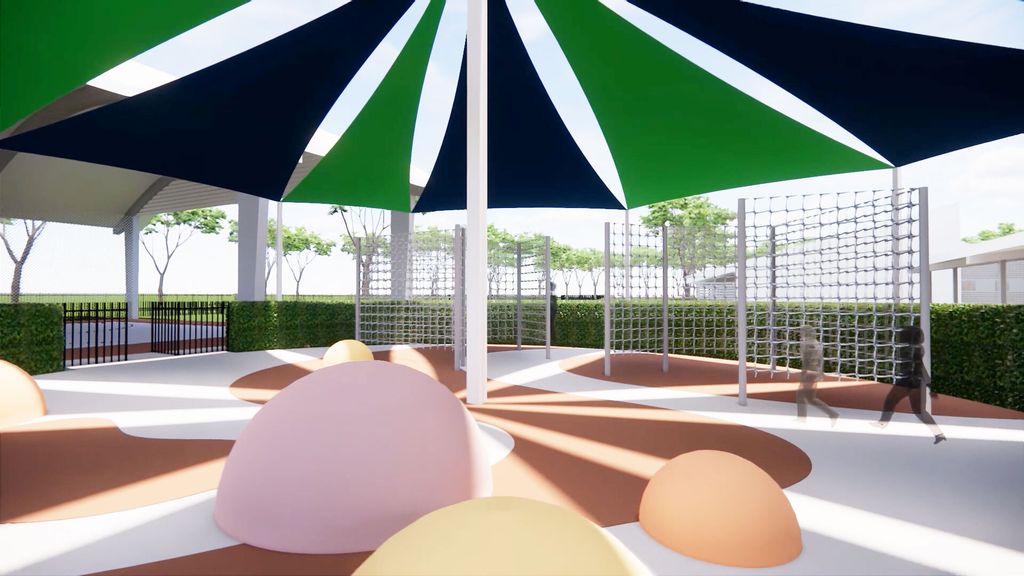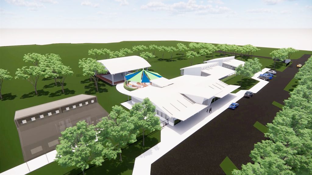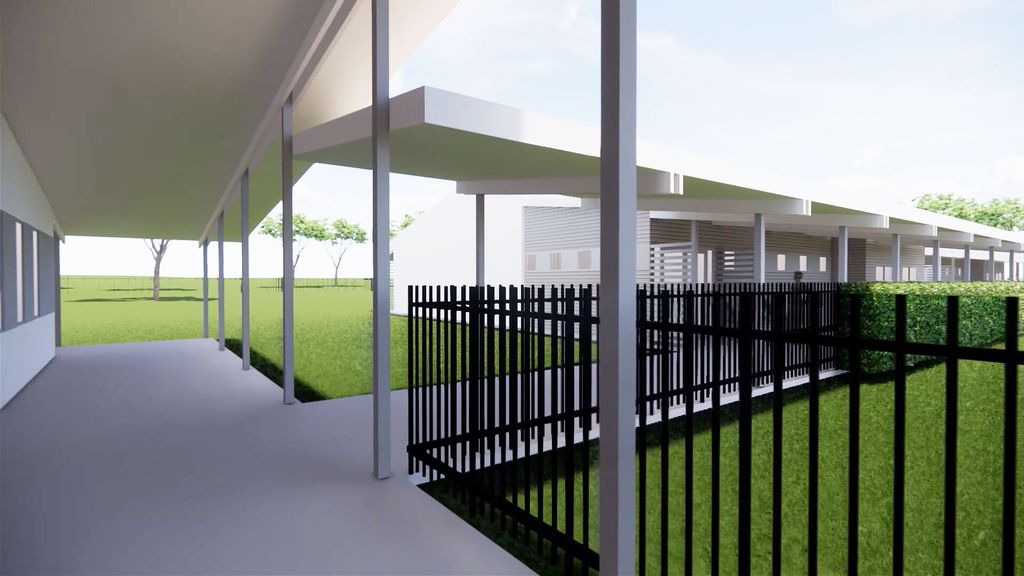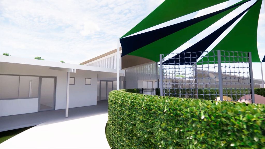 Two additional pods (each pod containing two classrooms and a reset room) will be added in Stage 2, along with an expansion of the Admin building and playground.