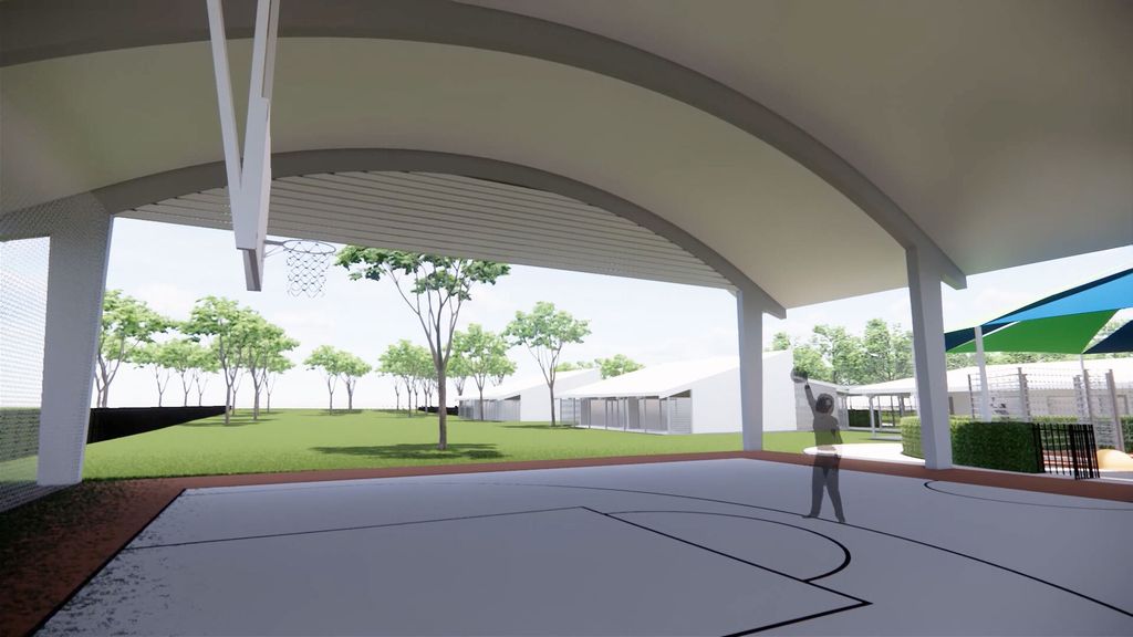 Stage 1 is made up of the Admin building, two pods each containing two classrooms and a reset room, and the beginning of the playground.